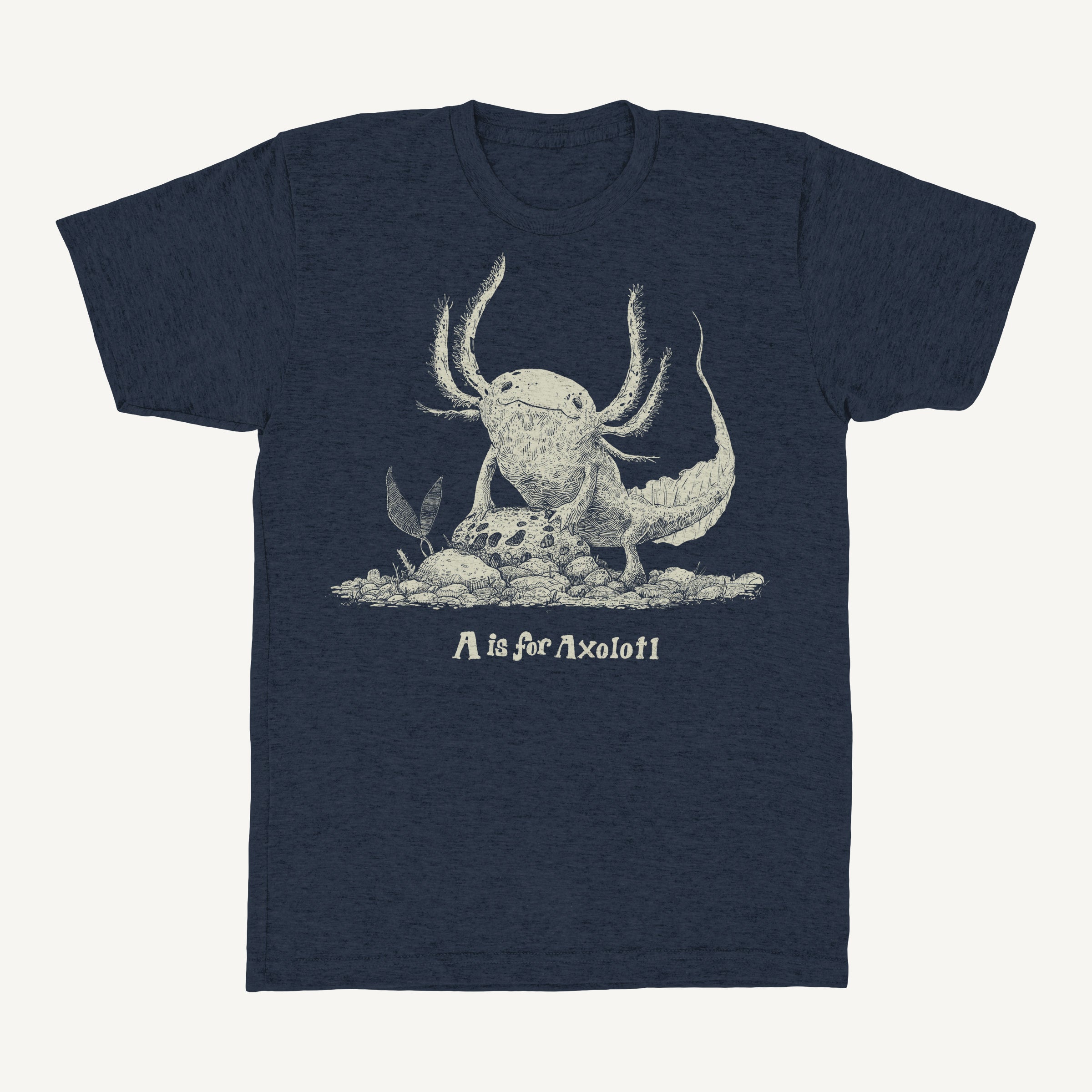 Add some personality to your outfit with this "A is for Axolotl" Hand-Printed T-Shirt, and let everyone know that you love these adorable and unique creatures.