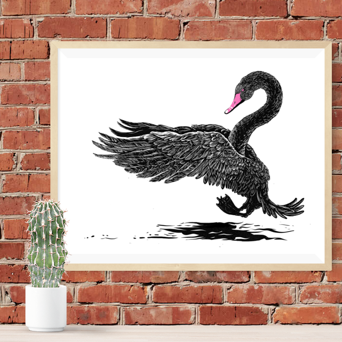 Featuring an original illustration of a black swan, printed with waterbased inks.
