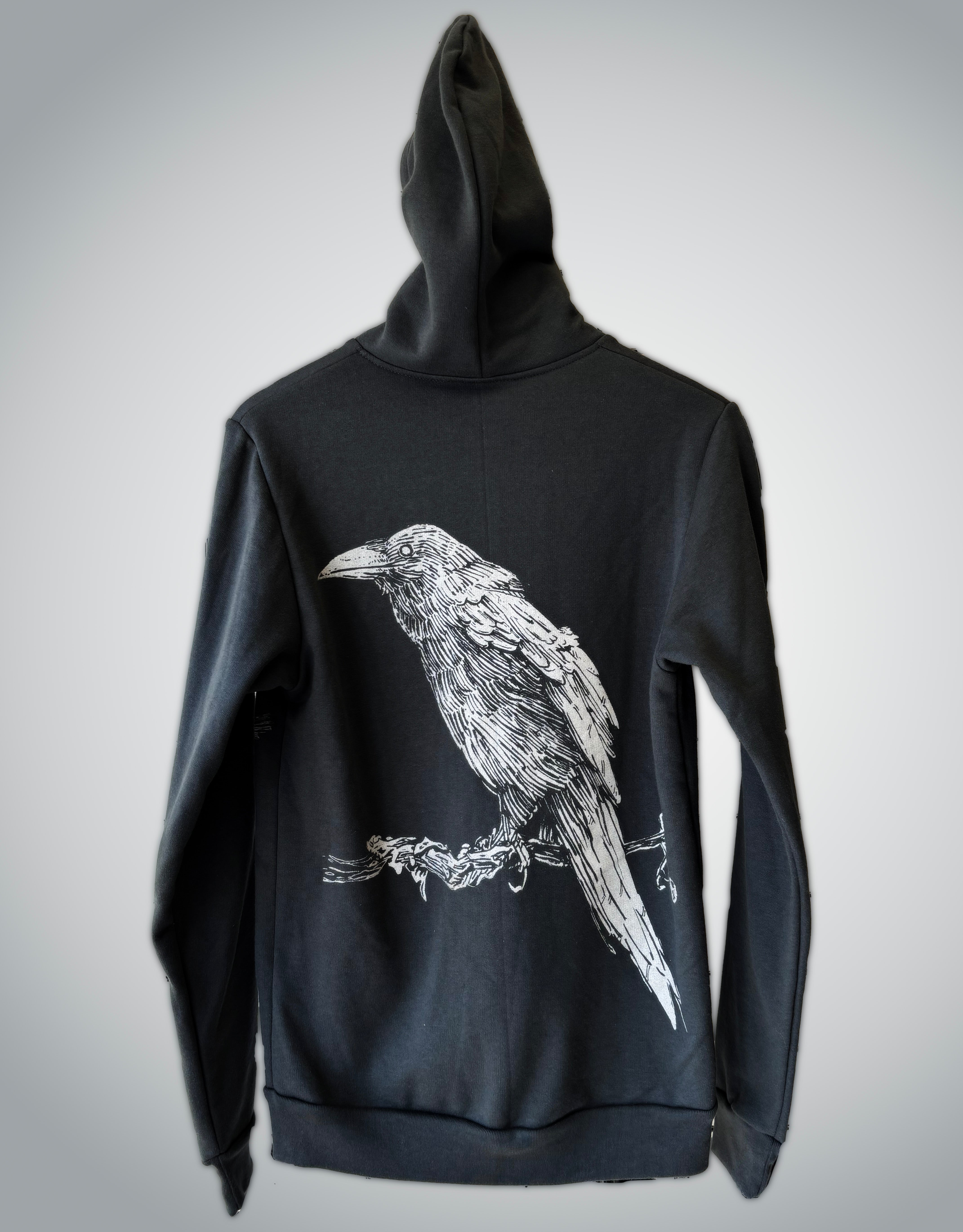 This slate grey zip-up hoodie features a striking raven printed on the back and birds printed on the front. Hand-printed with off-white water-based inks, the hoodie is made from a premium 50/50 ring spun poly/cotton fleece by Jerico. Each hoodie is 100% Canadian-made and hand-printed in Dartmouth, NS.