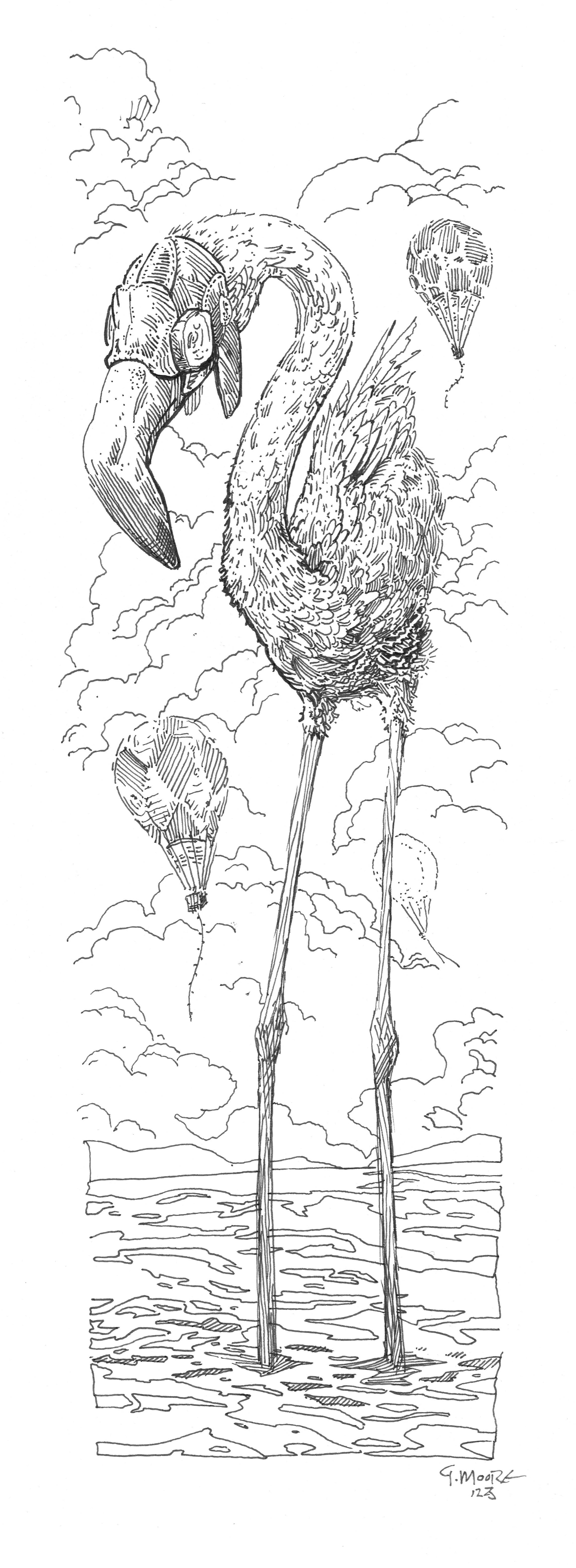 Flamingo with Balloons - Original Pen & Ink.