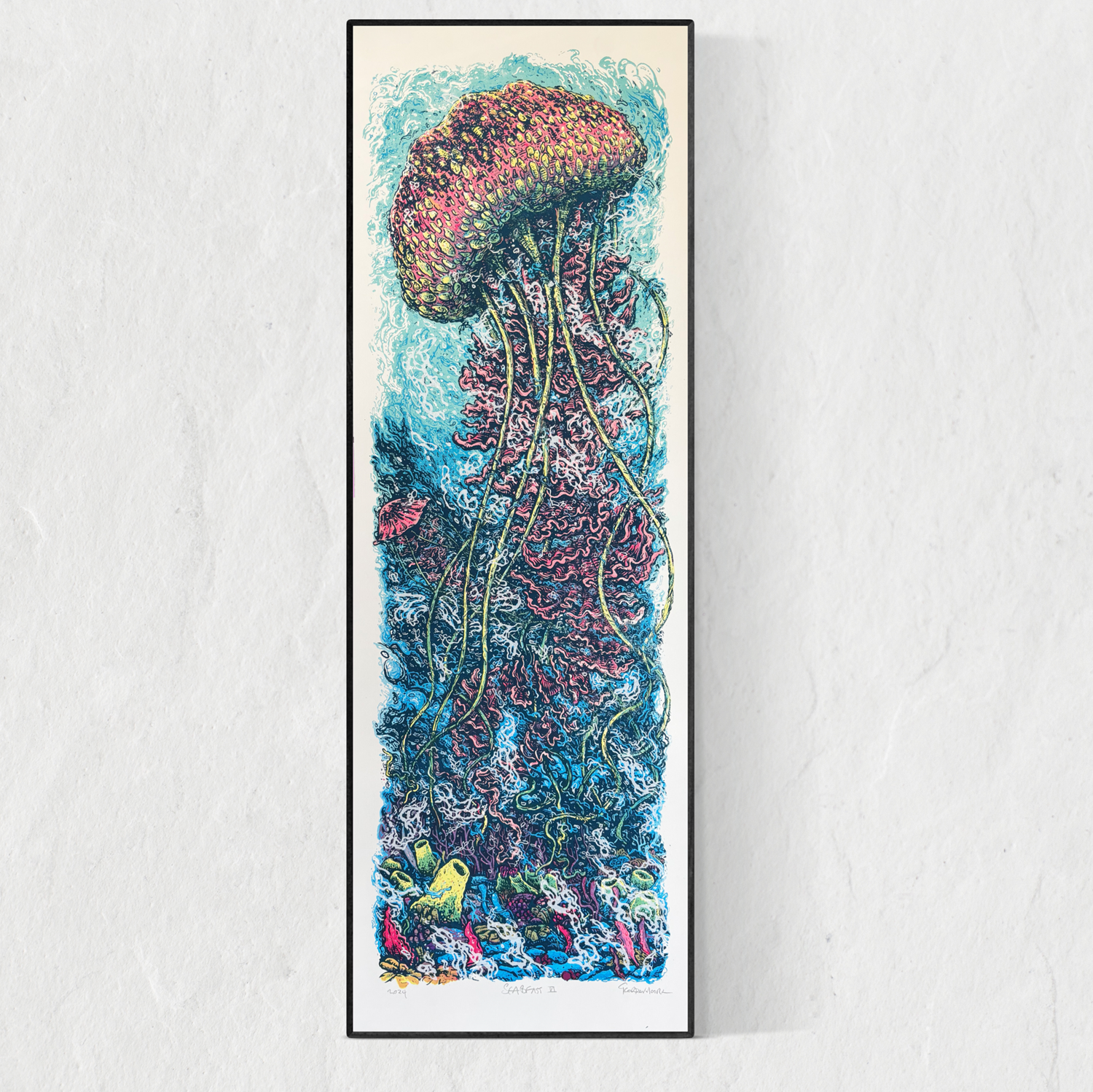 "Seabeast VI" is a vibrant nine-color, hand-printed silkscreen designed and printed by Geordan Moore. This print features super vibrant UV-reactive phosphorescent inks, making it glow brilliantly under blacklight. Measuring 12" x 36", it is available on two premium French Paper stocks: Starch Rain and Manilla. Size: 12" x 36" Paper Options: French Paper's Starch Rain or Manilla Inks: UV-reactive phosphorescent inks Printing: Hand-printed silkscreen Shipping: Shipped rolled in a sturdy cardboard tube