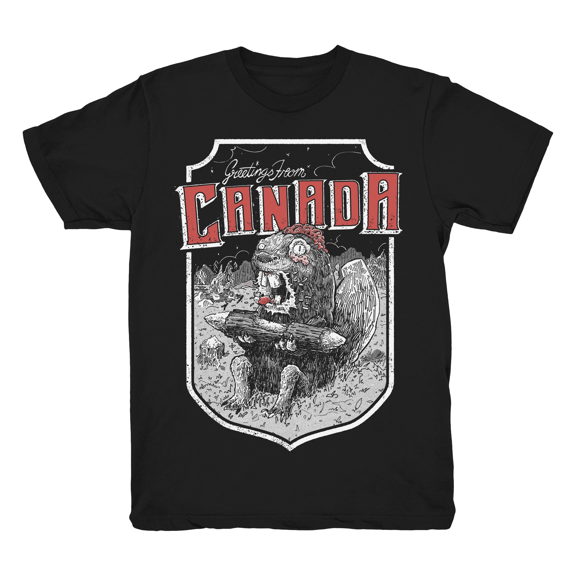 The undead beavers are back and better than ever! This is the third and best version yet of the Greetings from Canada design, featuring a horde of zombie beavers causing chaos. Printed in two colours on a black, Canadian-made organic cotton/recycled polyester t-shirt.